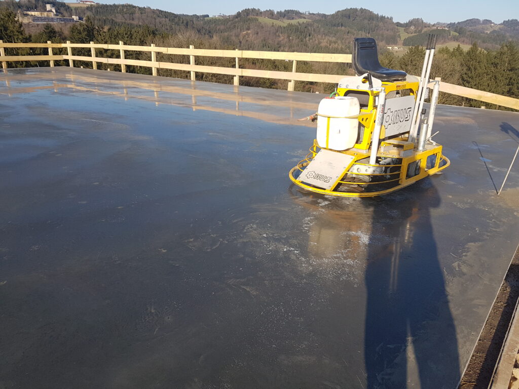Hierbei wird zunächst der Beton mit dem Flügelglätter vorbehandelt, damit die Oberfläche eben wird und eine feine Struktur bekommt.
